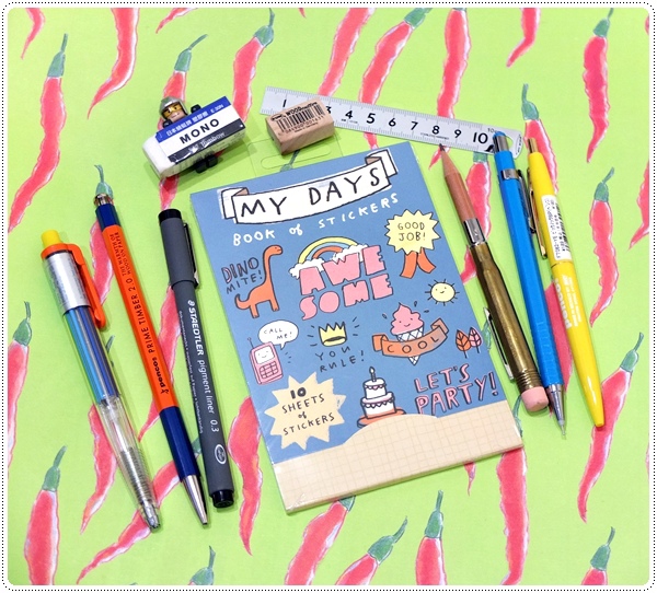 這張圖有可以當比例尺的東西,隨易放了幾枝筆擺盤,不然一本貼紙本太孤單了。