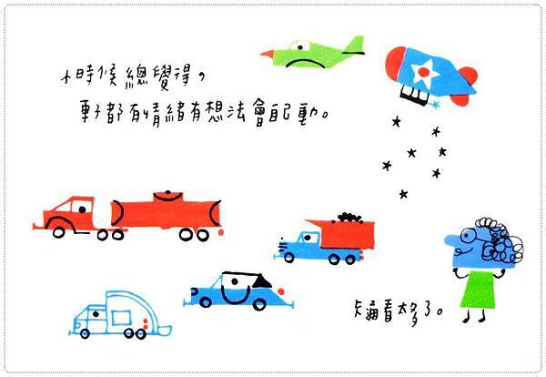 Ed Emberley有幫部分的交通工具畫上眼睛喔。讓我想起卡通裡的車,活靈活現的樣子。