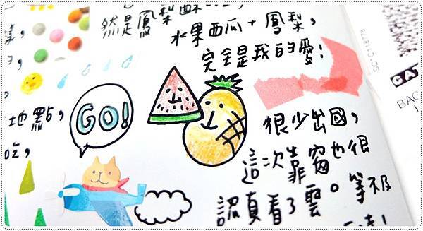 再來就是跟隨身本有關係啦,因為裡面有紀錄到飛機餐的水果,所以我也畫上來了。