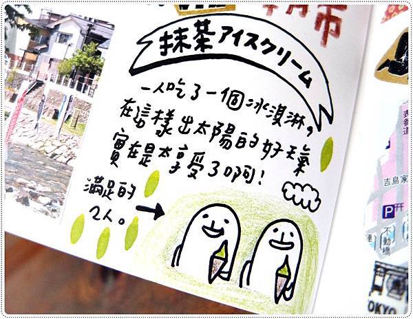 抹茶冰淇淋算是一個小標題,所以又畫了一個布條給他。綠色食物搭配綠色背景,然後也用鋼筆畫了一些葉子。