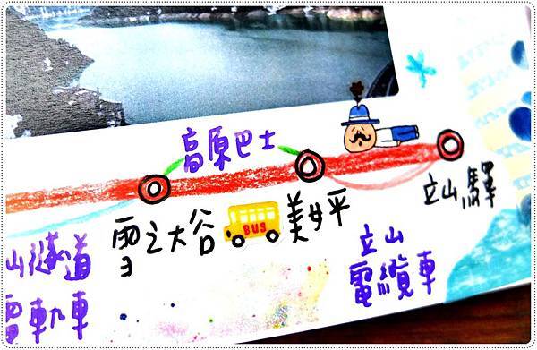 再來就是很認真畫了黑部立山的交通路線圖,包括用什麼交通工具都寫了上去。