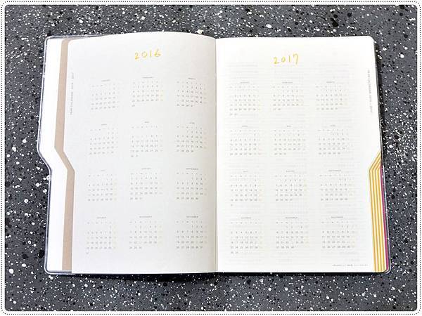 每本手帳必備的年曆。2016年和2017年跨頁,用的是很可愛的黃色配色。