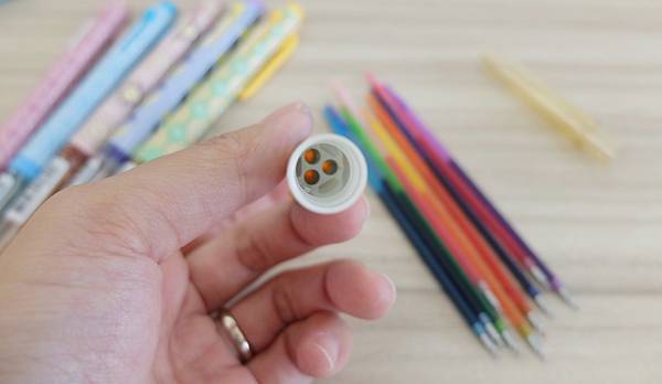裝筆芯超級簡單,旋開看到裡面有三個洞,就是三枝筆芯要插進去的位置。